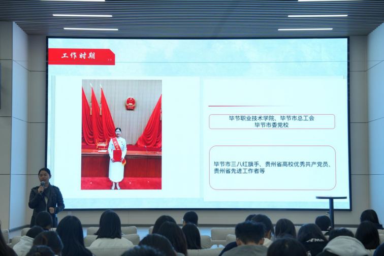 曾荣以“学生时代”“大学生活”“工作时期”“对外交流”“课程开发”和“品牌打造”六大板块为主线,系统回顾了个人成长与发展的轨迹。学生时代,曾荣就读于毕节学院,积极参与各类活动与竞赛,并荣获国家奖学金等多项荣誉;大学期间,她围绕“展所长、丰活动、夯专业、固情谊”四个维度全面提升自我;工作后,先后在职院、工会和党校等多个岗位历练,获得“三八红旗手”“省高校优秀共产党员”等荣誉称号;而在对外交流、课程开发与品牌打造方面,她聚焦“深耕主业”“提质课程”“做优服务”,形成了三大突出成果。