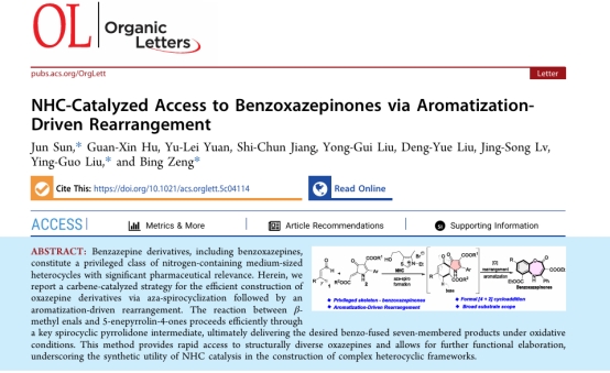 2025年11月,我校化学工程学院孙俊博士的研究成果 “NHC-Catalyzed Access to Benzoxazepinones via Aromatization Driven Rearrangement”在有机化学领域国际期刊《Organic Letters》在线发表。文章电子版可通过以下链接访问:https://pubs.acs.org/doi/10.1021/acs.orglett.5c04114。