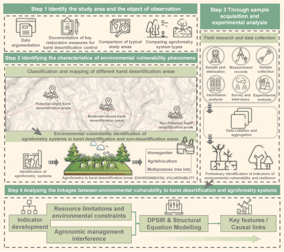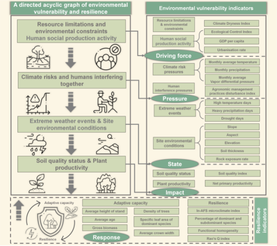 该成果针对石漠化治理农林复合系统如何应对人地关系负向互馈、持续提升生态产品供给能力基础的实际问题,围绕农林复合系统环境脆弱性评估及其生态韧性提升机制等国际前沿科学问题,结合中国南方喀斯特生态安全与区域可持续发展的国家战略和地方需求,通过构建综合评估框架与实证分析,重点从石漠化治理农林复合系统的环境脆弱性驱动机制、环境脆弱性与韧性的动态关系及分区恢复路径方面进行探讨,为科学推进石漠化治理提供了新的方法论和决策依据,有助于探明农林生态系统反服务、优化生态系统功能及提升生态产品供给能力的相关问题。结论如下:
