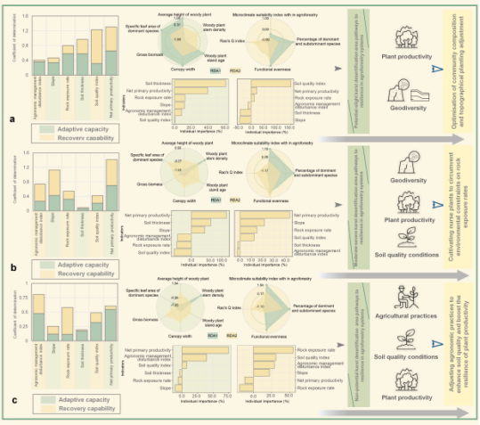 (3)阐明了环境脆弱性驱动因子对农林复合系统韧性(适应力与恢复力)的具体作用路径并提出了基于实证的分区恢复策略。通过随机森林和冗余分析量化了各驱动因子对韧性指标的贡献度。结果表明,岩石裸露率、净初级生产力、坡度和农艺管理干扰指数是影响韧性的核心要素。基于此,提出了针对不同石漠化程度的差异化、可操作的韧性提升策略(图4):在潜在-轻度石漠化治理区,应聚焦优化群落组成与地形种植模式,发挥地质多样性效益;在中度-重度石漠化治理区,核心是整合地质多样性、植物生产力与土壤质量,通过培育“护养植物”克服表层喀斯特带资源约束;在非石漠化区,关键则在于避免过度农艺干扰,通过优化管理维持生产力与土壤健康。上述策略为响应落实全国重要生态系统保护和修复重大工程总体规划(2021-2035年)在长江重点生态区、南方丘陵山地带等进行石漠化综合治理生态保护和修复重大工程的号召,为喀斯特脆弱生态区的农林生态系统反服务的探明、人地系统协同调控以及科学推进石漠化治理提供了重要的理论依据,也可为全球其他喀斯特生态脆弱区的可持续农业管理提供参考。