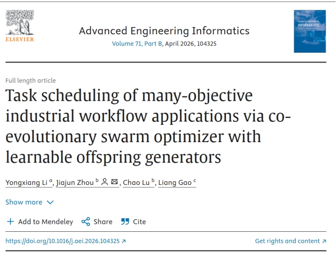 2026年1月,我校机械工程学院李永湘教授的研究成果“Task scheduling of many-objective industrial workflow applications via co-evolutionary swarm optimizer with learnable offspring generators”在工程技术领域国际权威期刊《Advanced Engineering Informatics》在线发表。文章电子版可通过以下链接访问:https://www.sciencedirect.com/science/article/abs/pii/S1474034626000170。