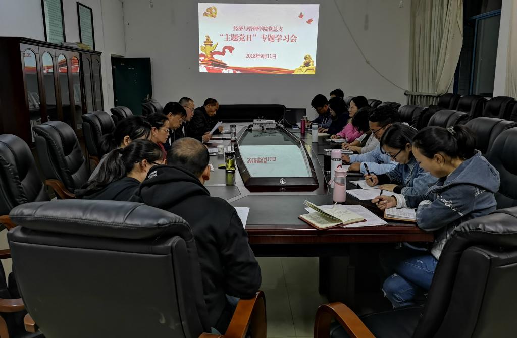 9月11日晚,经济与管理学院党总支在学院会议室开展2018年9月“主题党日”专题学习活动。学校党委书记陈永祥同志以普通党员身份参加活动并作交流发言,经济与管理学院全体教职工党员参加活动。活动由经济与管理学院党总支书记张翔主持。