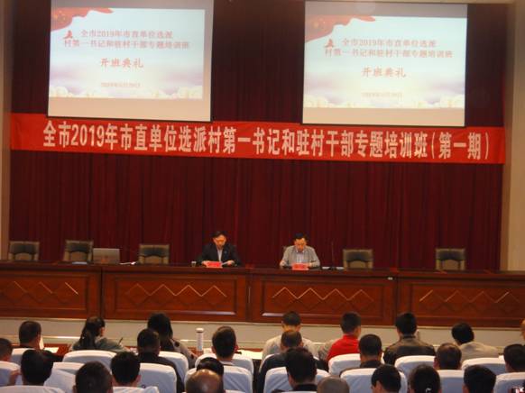 本次全市2019年市直单位选派村第一书记和驻村干部专题培训分两期进行,每期培训时间为三天,共培训市直单位选派村第一书记和驻村干部300人;培训内容主要包括习近平总书记关于扶贫工作的重要论述、脱贫攻坚“春季攻势”重点任务、如何加强村级党组织建设、扫黑除恶专项斗争有关知识、“五步工作法”和村级组织建设“一任务两要点三清单”、支部工作条例和农村基层组织工作条例解读、农村党支部标准化规范化建设、如何做好发展党员工作、如何抓好有组织劳务输出、易地扶贫搬迁后续工作“五个体系”建设、驻村工作经验介绍、做好群众工作的方法等。