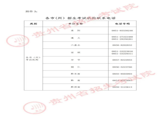 (八)考生在报名报考过程中遇到问题可与当地招生考试单位联系或咨询(联系电话见附件3)。其他相关事宜,可关注贵州省招生考试院网站、微信公众号等,及时查阅有关通知要求。