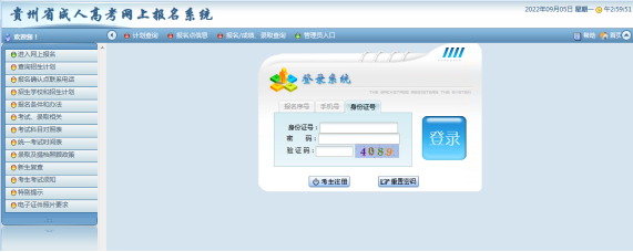 本系统为贵州省成人高考网上报名系统,为了提升系统的安全性,考生需要登录后才可以使用本系统。