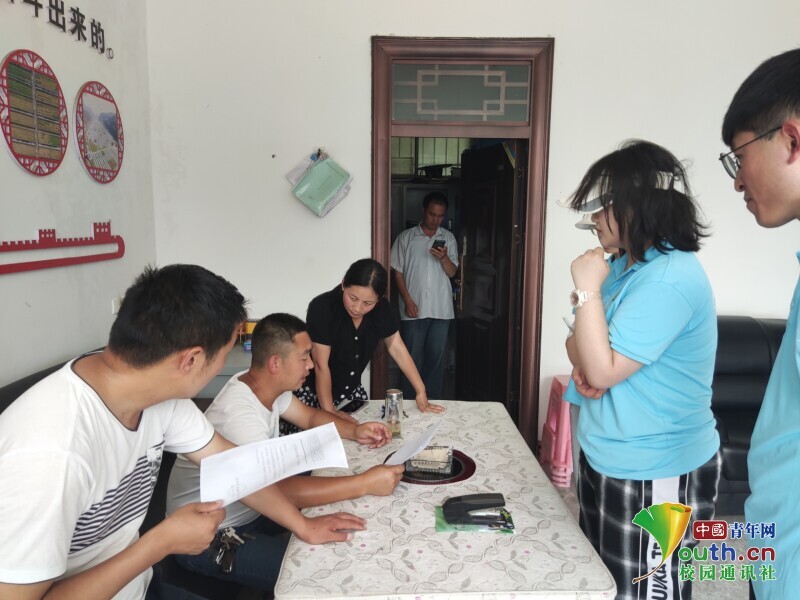 志愿者与村委会干部交流村里留守儿童家庭情况