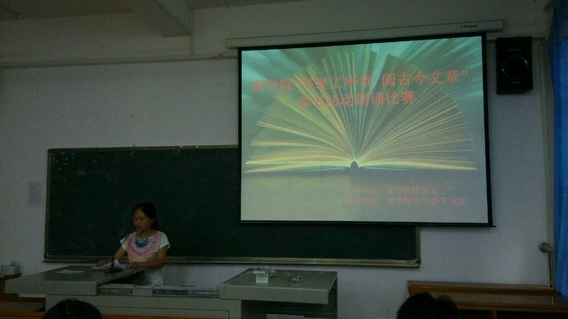 经过一个多月的紧张筹备,理学院“书理工华章 阅古今文章”读书活动朗诵比赛于6月19日晚在绣山实验楼B栋202教室隆重举行。本次比赛以理学院开展的“书理工华章 阅古今文章”读书活动为契机,共有十名选手以“我最喜欢的一篇文章”为主题选择篇目参加朗诵比赛。理学院党总支副书记刘竹影老师、团总支书记余颖老师、团总支副书记聂登国老师、辅导员周将军老师、吉婷老师担任评委。由于赛前准备充分,选手们在台上仪态大方,从容淡定,充满自信,现场的观众也被选手们声情并茂的朗诵带入了如画的境界。整场比赛气氛活跃,秩序井然,体现了理学院学生的良好素质。
