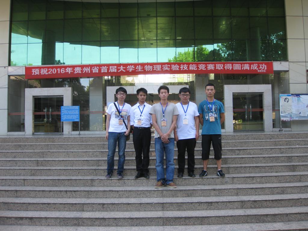 为激发大学生对物理学和物理实验的兴趣,提高大学生的创新意识、创新精神、知识综合运用能力和实践能力。贵州省首届大学生物理实验技能竞赛于2016年7月25日在贵州大学物理实验中心举行,全省十一所高校参加了此次竞赛。理学院王军、王全兴、李虎跃、叶雄、樊坤五名同学代表贵州工程应用技术学院参赛。