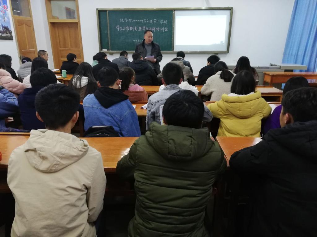 2019年3月7日下午5:00—5:30,理学院在绣山实验楼B栋202教室召开学生干部培训会。参加会议的有党总支书记王兴、副书记熊斌、团总支书记聂登国、团总支副书记马玉栋、辅导员、班主任及全体学生干部。 培训会指出,学生干部的地位和作用可概括为:一是联系老师和学生的“桥梁”、“纽带”,把老师的思想、观点和分派的任务传达给同学,组织同学具体实施;二是参与部分活动项目的决策,把同学中的意见、想法和存在问题反馈给老师,以便及时解决。