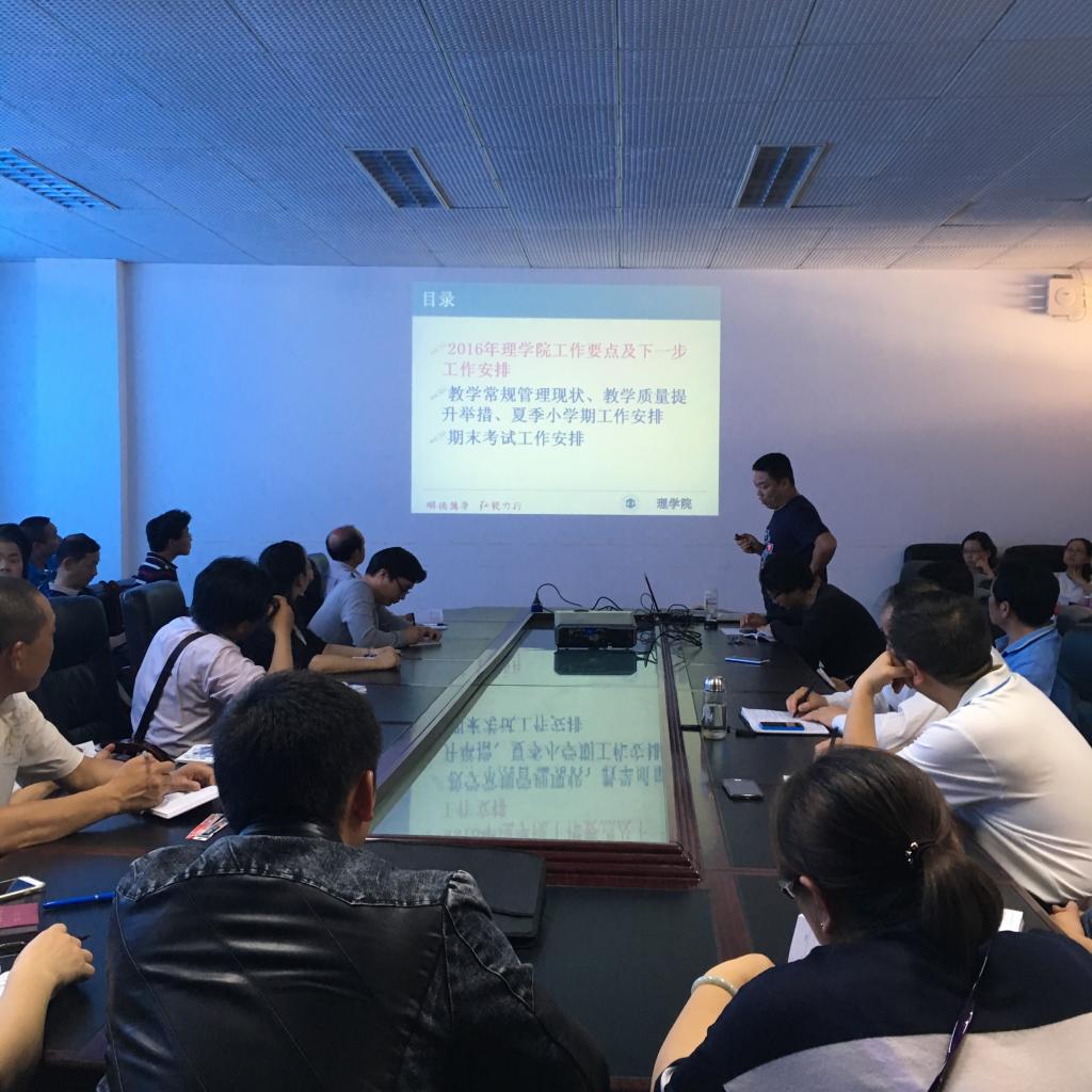 “两学一做”基础在学,关键在做。为了强力推进教学、科研、管理、改革等中心工作,理学院于2016年5月30日下午3:00—5:30召开全体教职工大会。由副院长高慧昀全面系统的回顾总结上半年的工作,在充分肯定成绩同时,针对目前工作中存在的问题,提出了整改措施,并就2013级毕业论文、实习实训、夏季国考辅导等工作做了详细安排。会议由院长王朴主持。