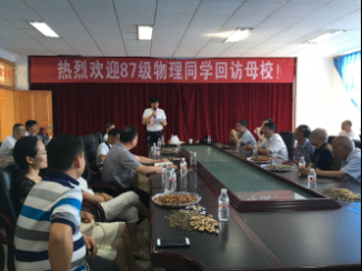 理学院党政班子代表学校向87级物理班同学回访母校表示热烈的欢迎!向同学们介绍了学校和本院发展概况,近三年来所取得的成就,诚邀同学们明年参加建校80周年大庆,希望全体校友加强与母校交流、沟通,常回家向师弟、师妹们传经送宝。