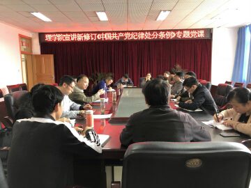 根据学校党委组织部的安排部署,理学院党总支于2018年9月17日下午3:00-4:00,以“深入学习领会习近平总书记在全国宣传思想工作会上讲话精神,全面理解重新修订《中国共产党纪律处分条例》的重要意义,着重把握《中国共产党纪律处分条例》新修订的内容,做学习践行新条例、遵规守纪模范”为主题,组织全体党员学习《人民日报评论员:把“九个坚持”作为根本遵循——论学习贯彻习近平总书记在全国宣传思想工作会议重要讲话精神》,厦门大学新闻网登载的《学校召开会议通报近期有关事件处理情况》。以党课方式,对重新修订的《中国共产党纪律处分条例》进行了宣讲。