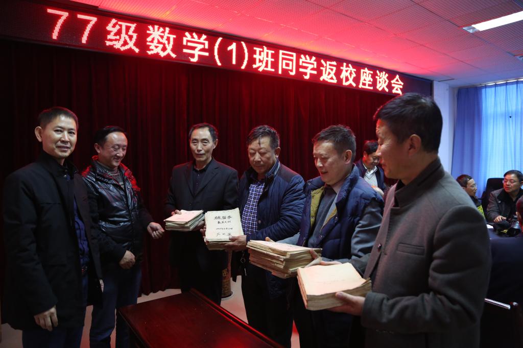 座谈会上,全体校友向学校赠送了礼物,严世康、罗运琪向校史馆捐赠老师们编写同学们刻印的讲义:高等代数,数学分析讲义,解析几何讲义(平面部分),解析几何讲义(空间部分),集合论初步与概率论讲义,初等数学复习及研究(平面几何部分),教学论、教育论专题,高等数学习题集,初等代数复习练习题,数学分析题解,解析几何习题解答,中学三角代数部分题解,数学(历届高考试题),以及相关学习科目课堂笔记和作业本。