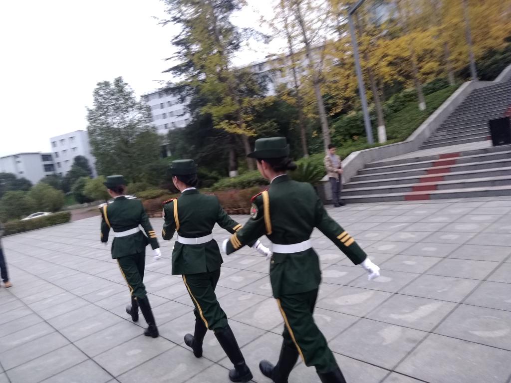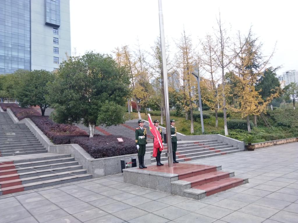 英姿潇洒的国旗护卫队踏着矫健的步伐护卫着国旗走向国旗台。国旗护卫队各就各位准备就绪后,催人奋进国歌响起,鲜艳的五星红旗缓缓的迎风升起。所有老师和同学目光注视着徐徐升起的五星红旗,向国旗行注目礼。