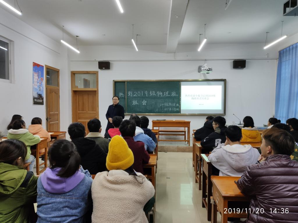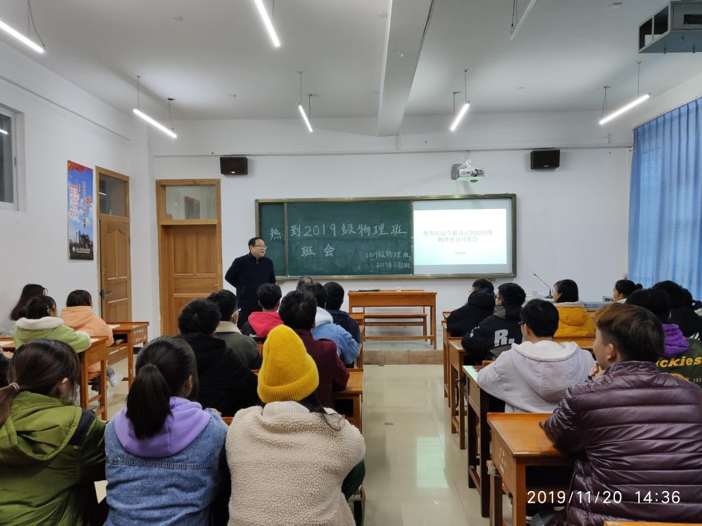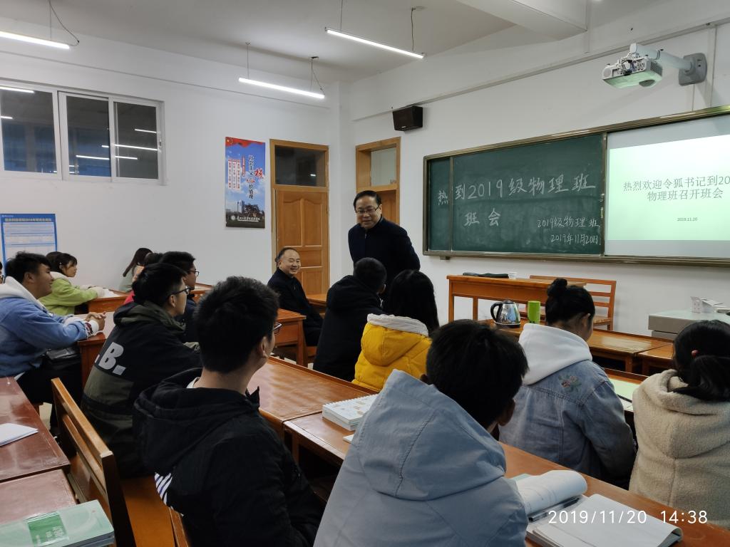 为进一步落实立德树人根本任务,广泛听取学生对学校建设发展意见建议,了解学生所思、所想、所忧、所盼,帮助学生切实解决学习、工作、生活中遇到的困难和问题,扎实推进“不忘初心、牢记使命”主题教育落地见效,学校党委书记令狐荣锋同志于2019年11月20日下午2:30来到理学院绣山B栋实验楼202教室给2019级物理本科班全体同学召开主题班会。