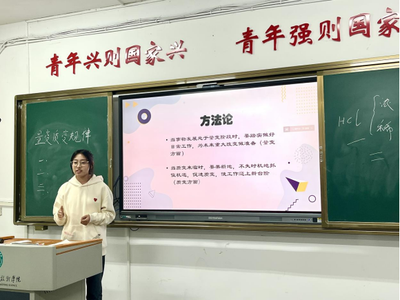比赛过程中,参赛选手们紧扣思政主题,结合自身的学习感悟和生活实际,用贴近生活的话语、富有感染力的讲述,将理论知识与鲜活案例深度融合,让思政课内容“活”起来。李昌琴同学以粉笔的消磨为喻解释了量变质变规律;赵梓萱同学关注社会热点,探讨了当代青年在实现中华民族伟大复兴征程中的责任与担当,鼓励同学们创造有价值的人生。选手们的精彩表现赢得了现场观众的阵阵掌声。参加选手不仅展现了扎实的思政理论功底,而且体现了当代大学生积极向上的精神风貌和强烈的社会责任感。