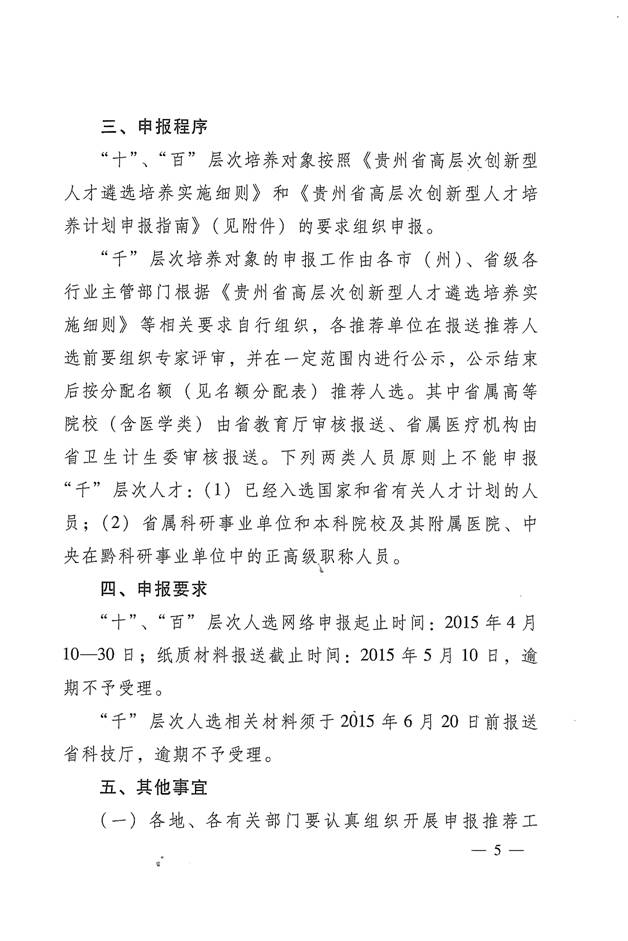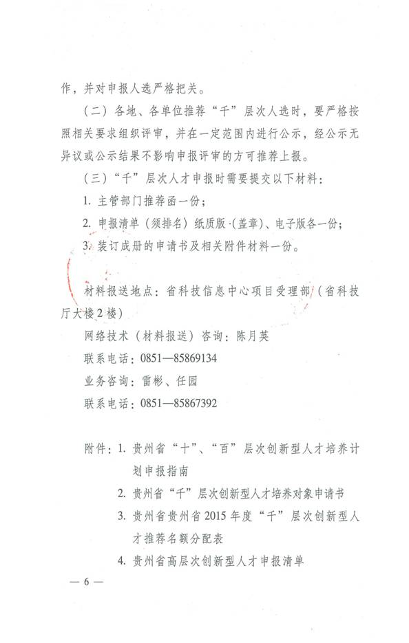 现将中共贵州省委组织部《关于开展2015年度高层次创新人才申报工作的通知》(黔组通〔2015〕24号)转发给你们。请按照通知要求组织做好2015年度高层次创新人才申报工作。因“十、百”高层次创新人才网报时间4月10日至30日(千层次创新人才申报不需网报,直接按文件准备电子和纸质资料),时间很紧。请符合条件的教职工及时在“贵州省科技厅项目申报平台”完成个人申报,纸质材料按文件要求准备好后于5月7日前报送(其中“千”层次创新人才申报材料可在5月20日前报送)到人事处,再按相关程序分别报省、市相关部门。联系电话:0857-8330261