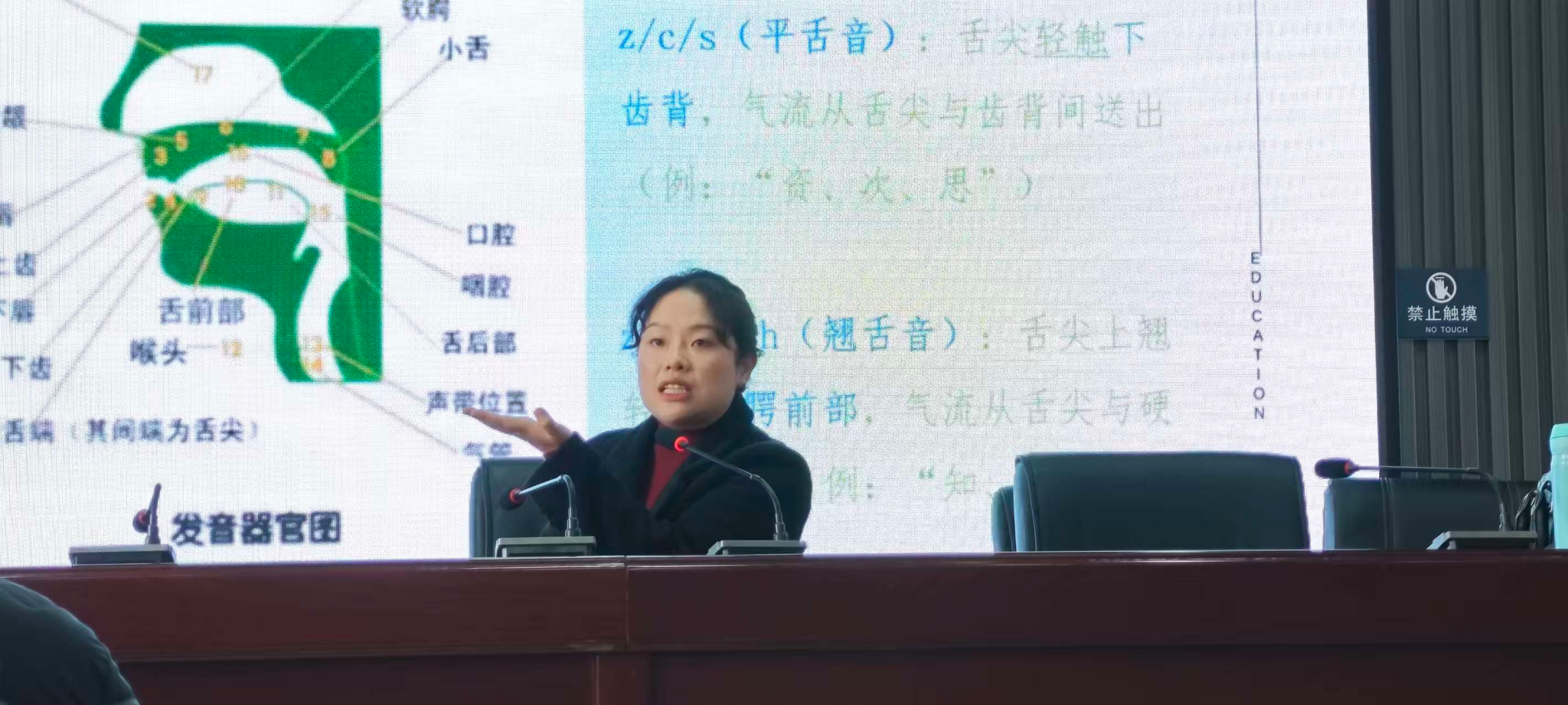 座谈会上,人文学院教师、贵州省普通话水平测试员陈德柯琳为中心小学、发开小学的基层教师开展了“语音发声”为主题的培训。培训结合本地方言特点,针对常见发音难点,通过示范朗读、情境模拟等互动方式,有效提升了参训教师的普通话教学能力。现场气氛活跃,交流热烈。