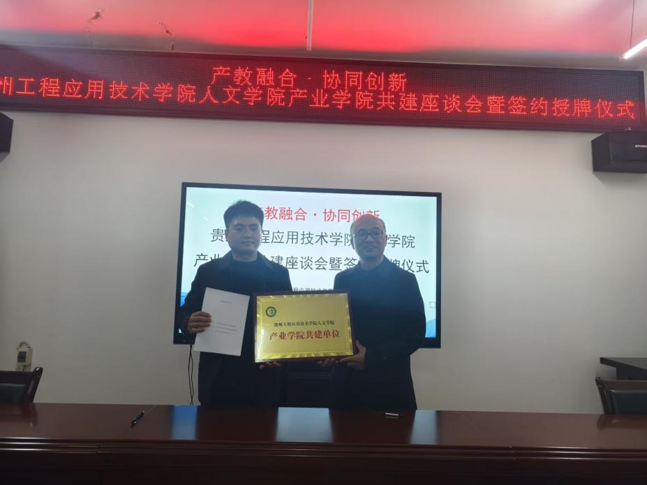 会前,人文学院副院长杨庆鹏带领企业代表参观了学院实训中心。会上,各家企业代表对人文学院实训中心建设、专业建设等各项工作给予了高度评价,结合自身业务提出合作方向。企业和学院双方就人才培养模式创新、实习实训基地建设、资源整合规划合作路径等议题开展深入交流,达成多项合作共识。最后,学院与9家企业签订技术服务合作协议,人文学院党总支书记周治勇为“贵州工程应用技术学院人文学院产业学院共建单位”授牌。