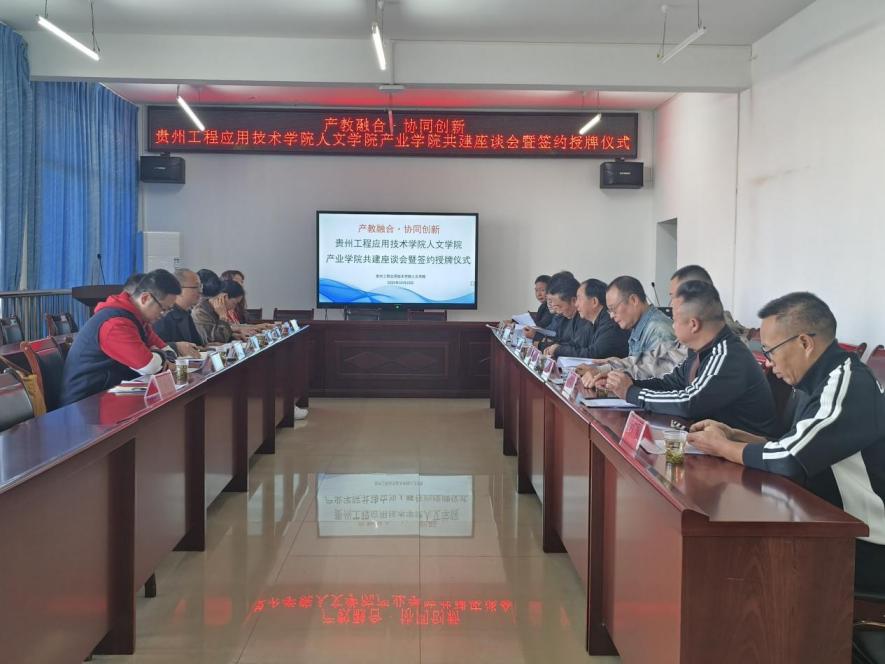 为深化产教融合、推动校企协同创新,2025年10月23日下午,人文学院组织召开“产教融合·协同创新”贵州工程应用技术学院人文学院产业学院共建座谈会暨签约授牌仪式,贵州天下毕商文化交流有限公司、贵州招卷猫网络科技有限公司等11家企业代表参会,会议由人文学院党总支书记周治勇主持。