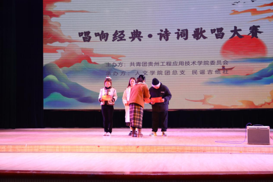 为传承和弘扬中华民族灿烂文化,贯彻落实优秀传统文化进校园,营造书香校园的浓厚氛围,帮助学生深入理解经典文化与时代主旋律。12月5日19:00,由共青团贵州工程应用技术学院委员会主办,人文学院团总支、民谣吉他社承办的第一届诗词歌唱大赛(决赛)在我校正心礼堂举行。本次比赛邀请人文学院团总支书记杨晓霞、汉语言文学教师张欣欣,艺术学院教师张锦华担任评委,约500名观众现场观看。