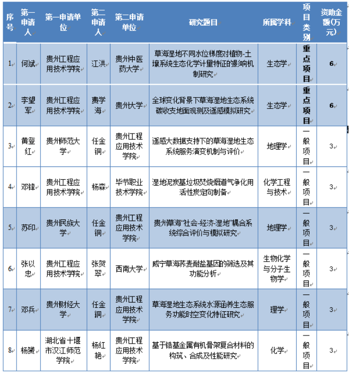 根据《关于组织申报“贵州省典型高原湿地保护与修复重点实验室开放基金项目”的通知》要求,经个人申请,共受理2021年度草海重点实验室开放基金项目申报12项。经过校外同行专家匿名评审,拟批准立项2021年度草海重点实验室开放基金项目8项,其中重点项目2项,一般项目6项。