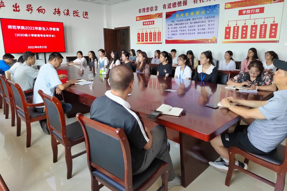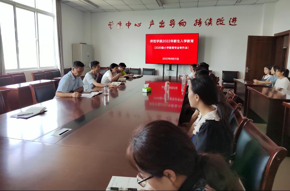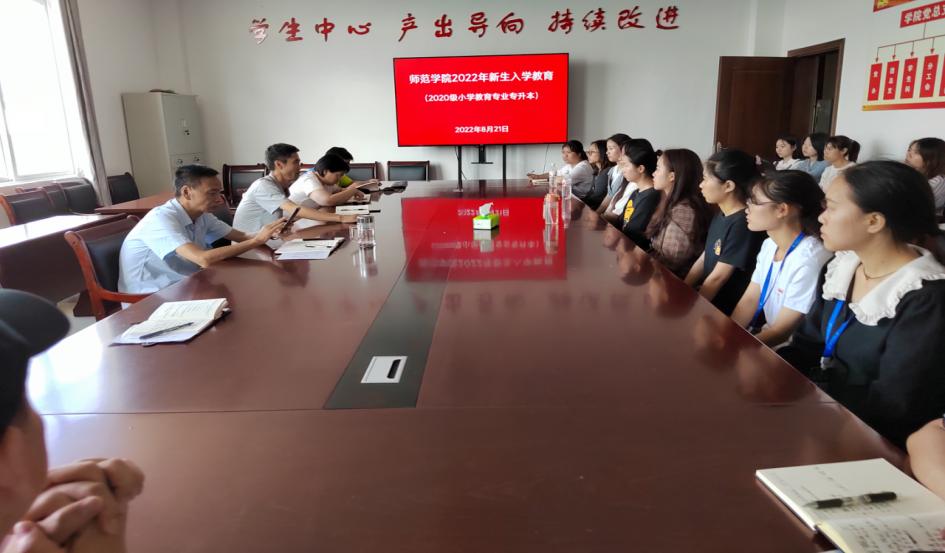 2022年8月21日下午15:00,师范学院在特教大楼为2022年录取的2020级小学教育专业专升本学生开展入学教育,党总支书记李华、院长李舒波、党总支副书记肖正和各科室负责人及班主任参加,会议由院长李舒波主持。