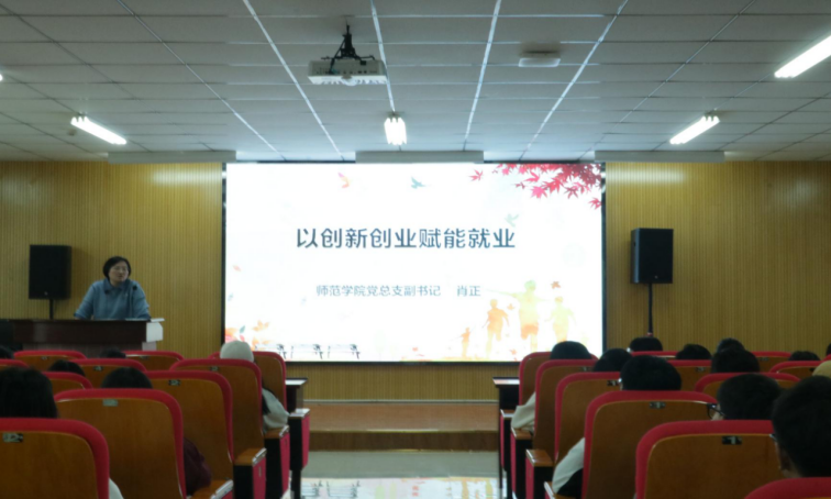 为深入贯彻落实党中央、国务院关于科技创新决策部署和全国高校毕业生等青年就业工作电视电话会议精神,推进以创新为支撑的全省高校师生创业就业,进一步激发全社会创新创业创造活力,师范学院于2024年5月28日开展“以创新创业赋能就业”为主题的专题讲座。讲座由师范学院党总支副书记肖正老师主讲,全院100余名同学参与。