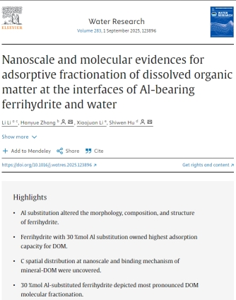 2025年5月26日,我院李丽博士取得的研究成果“Nanoscale and molecular evidences for adsorptive fractionation of dissolved organic matter at the interfaces of Al-bearing ferrihydrite and water”在环境科学与生态学领域权威期刊《Water Research》上在线发表。文章电子版可通过以下链接访问:https://doi.org/10.1016/j.watres.2025.123896。