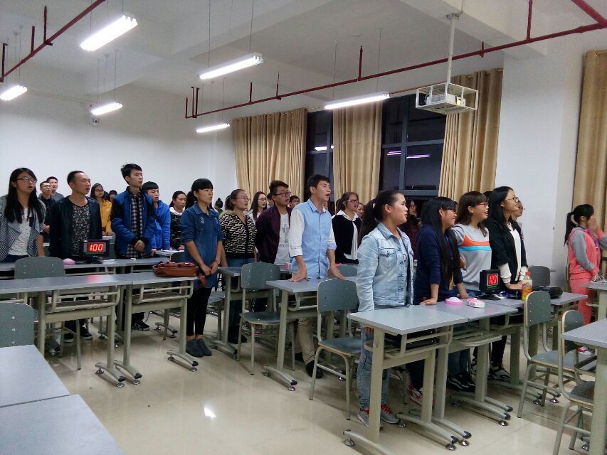 活动第一项议程是全体同学起立并唱团歌。第二项议程为学生预备党员、党员发言,其中胡志刚同学的发言题目是:“立足当下”,坚定信仰。李娟同学的发言内容为活在和平的年代,一定要牢记共青团员的使命,为祖国的发展、繁荣、昌盛做出自己应有的贡献。第三项议程为主持人讲解党团知识竞赛的活动规则以及活动流程。第四项议程进入党团知识竞赛环节。经过激烈竞答,2014地理科学本科班团支部夺得冠军, 2013级生物科学本科班团支部和2014级生物科学本科班团支部分别获得亚军和季军。