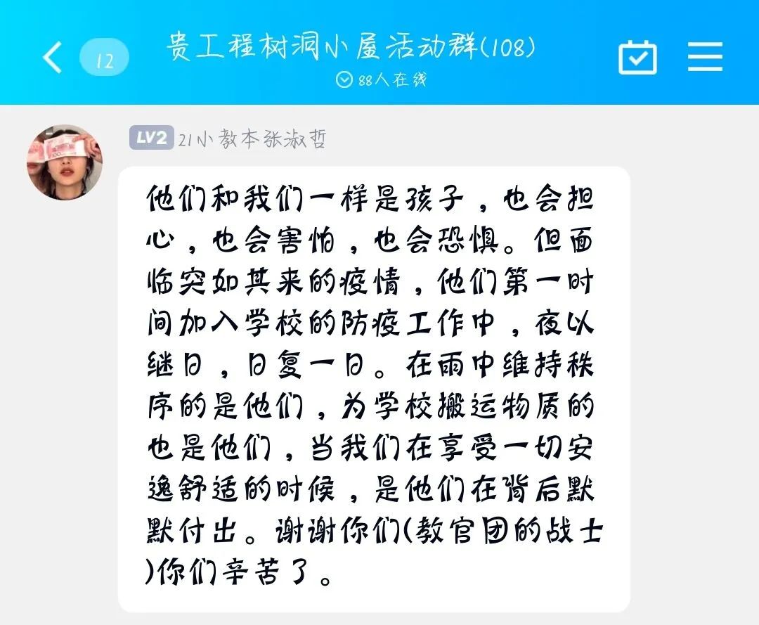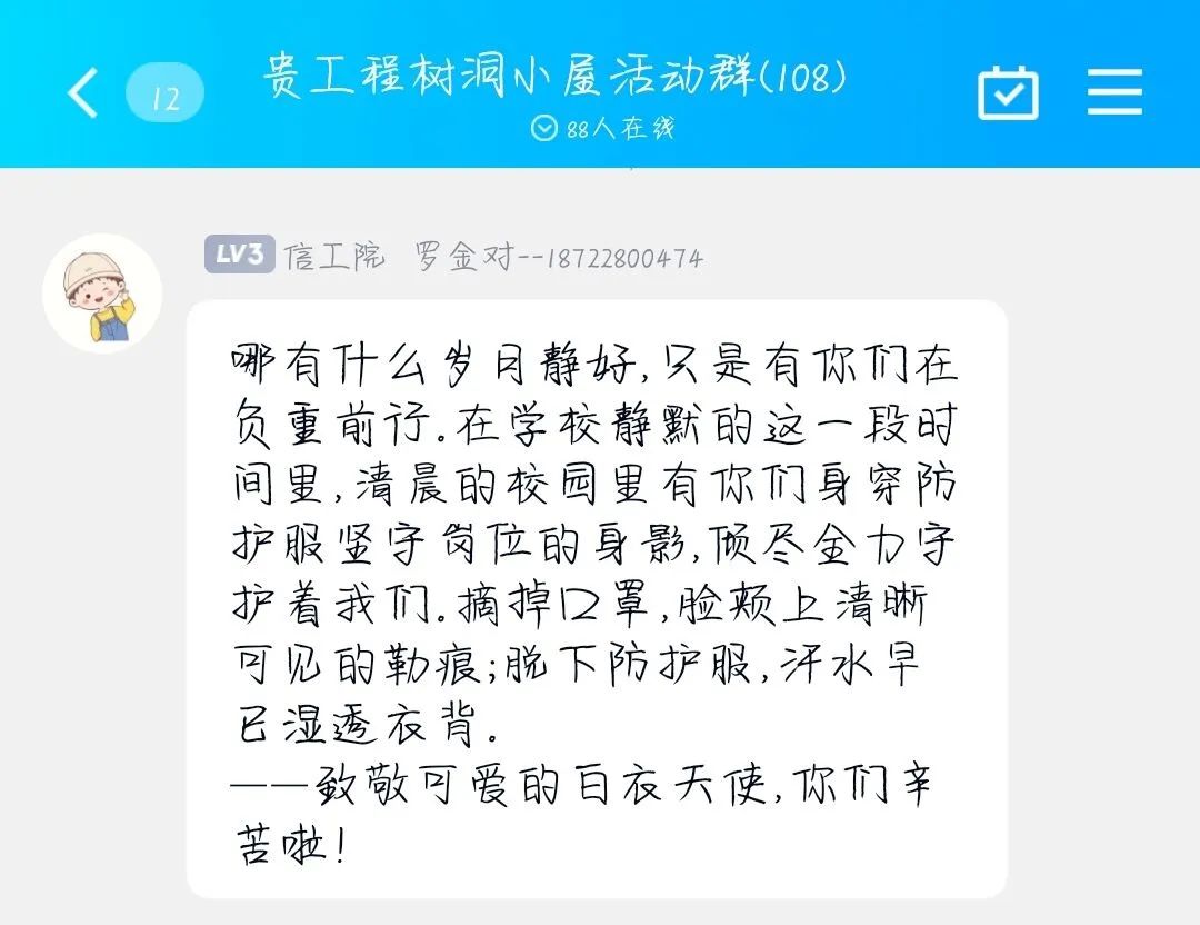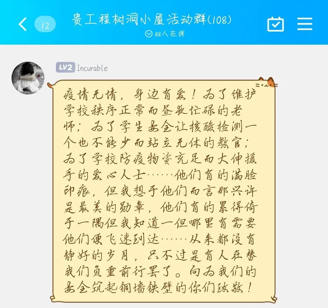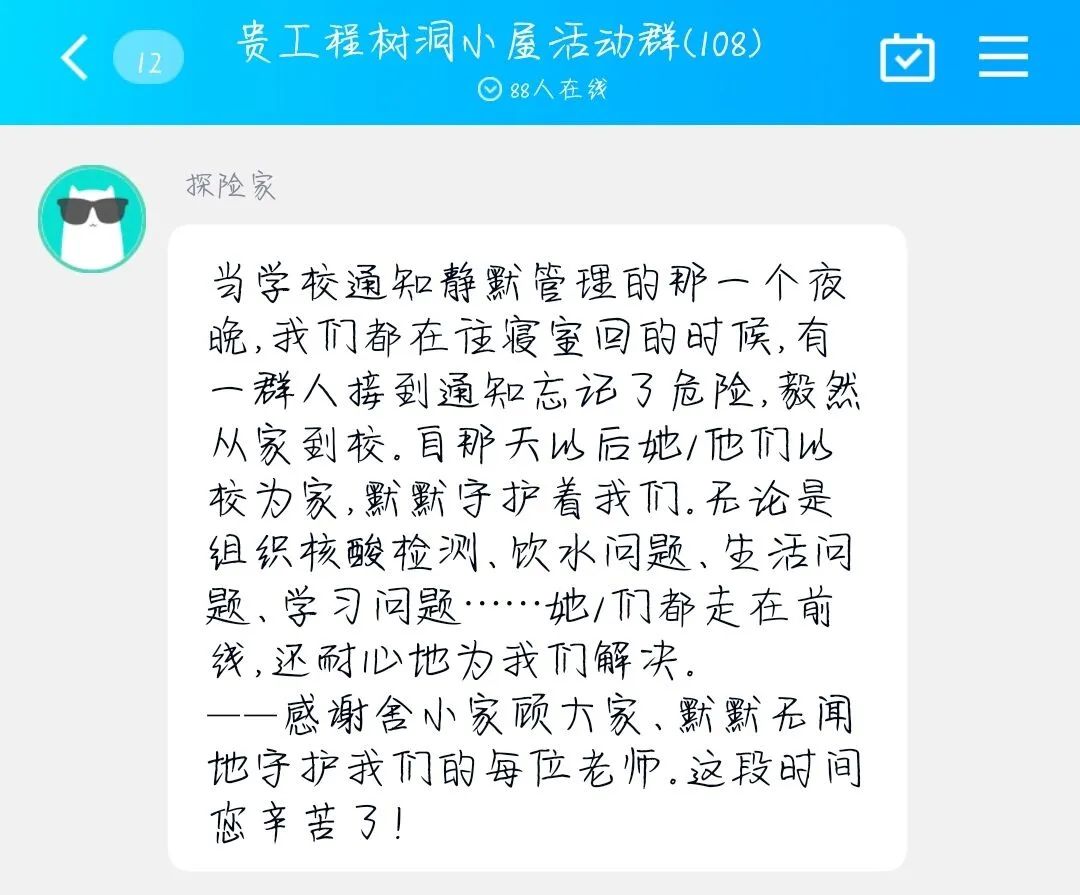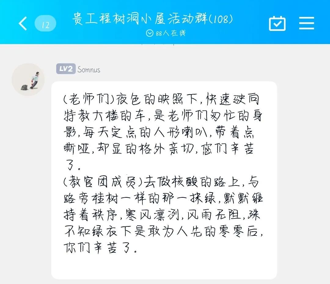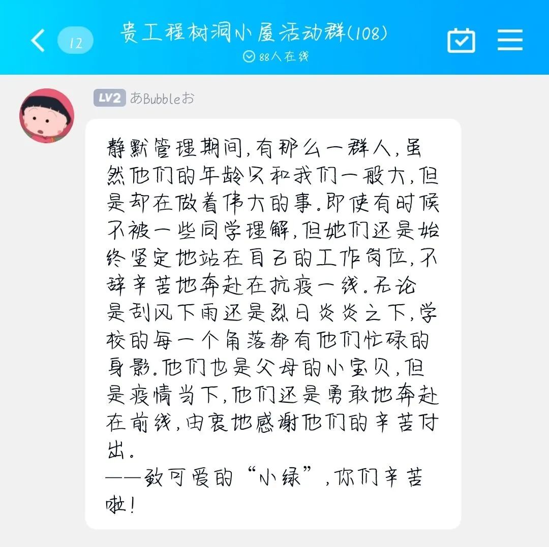 团团的树洞小屋已经开放一天了,同学们“文”令而动,用爱发声。用文字书写感恩,用语音传递感谢,那些笔下流淌的文字,那些朴实无华的声音诉说着感谢和致敬。让我们一起来听一听,看一看吧!
