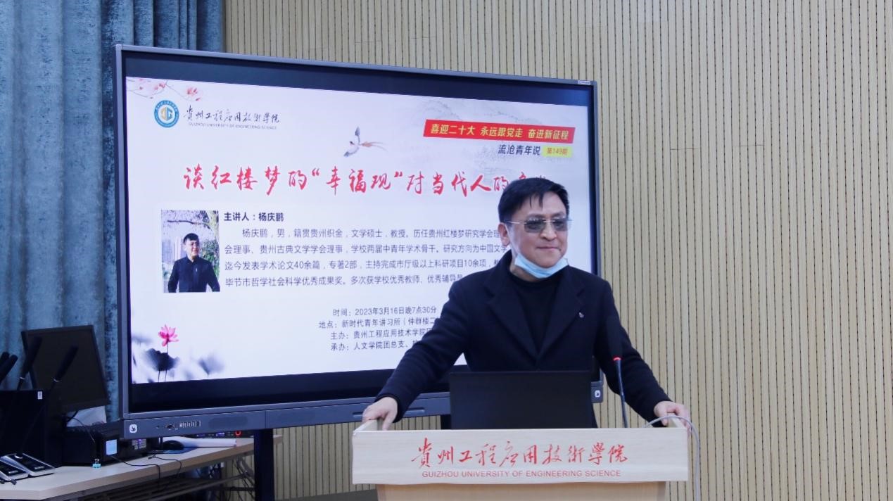 2023年3月16日,第149期流沧青年说在新时代青年讲习所开讲,本期主题为“谈红楼梦的‘幸福观’对当代人的启发”,人文学院副院长杨庆鹏主讲,80余名学生到场聆听。