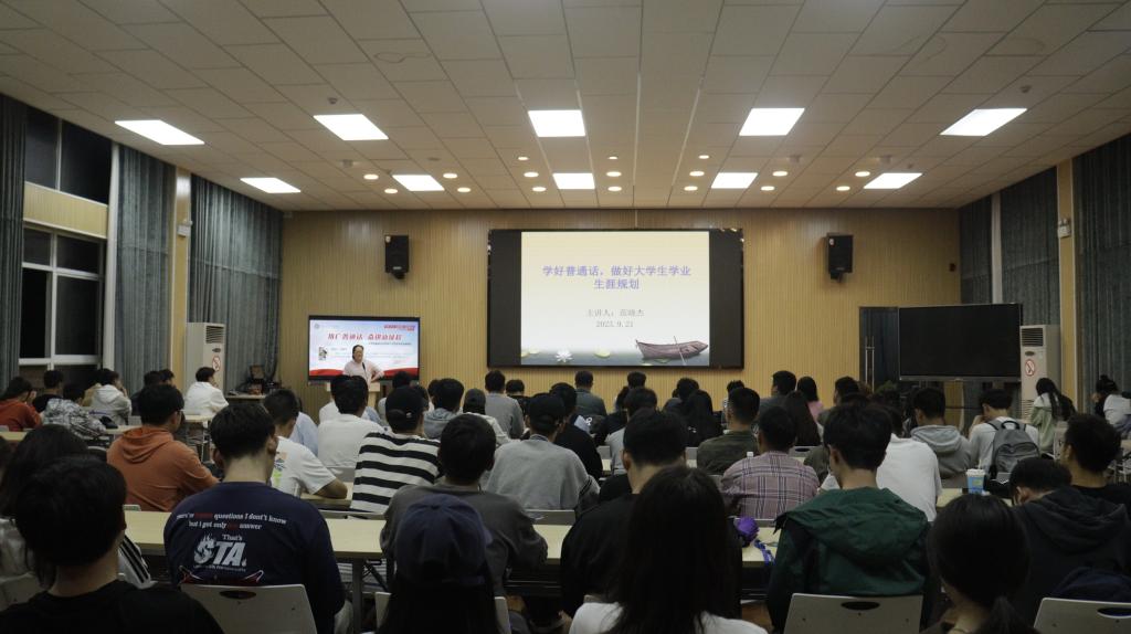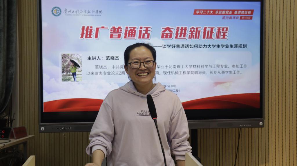 2023年9月31日晚,贵州工程应用技术学院第165期流沧青年说在新时代青年讲习所如期举行。本期主题为“推广普通话,奋进新征程——谈学好普通话如何助力大学生学业生涯规划”。此次青年说特邀机械工程学院辅导员范晓杰主讲,全校150余名学生到场聆听。
