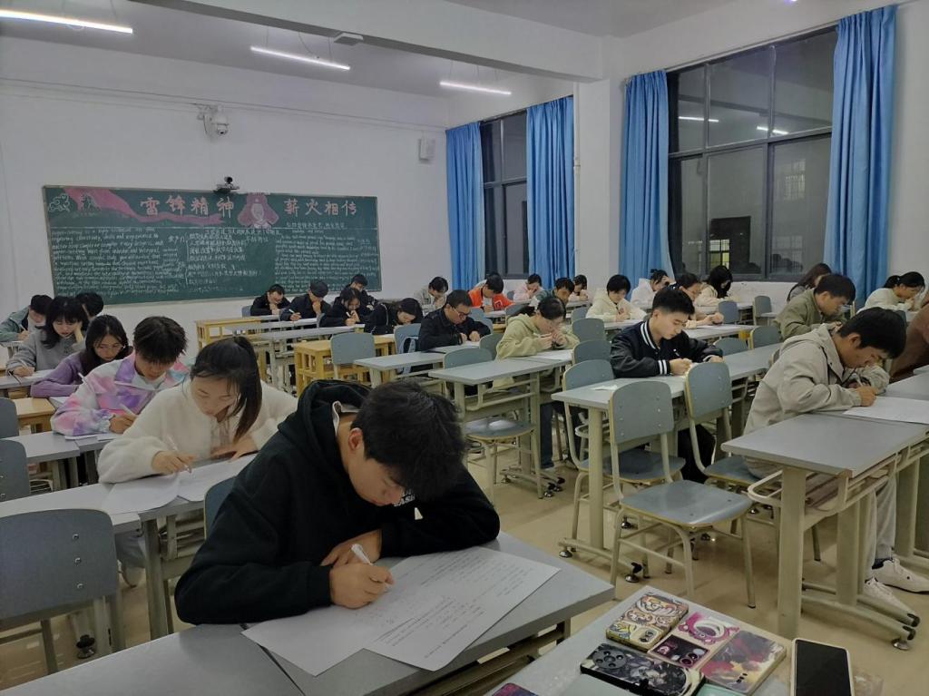 考场上,监考人员宣读考试纪律、分发试卷,竞赛学生认真审题、作答。随着铃声响起,本次竞赛答题结束,竞赛人员有序退场。