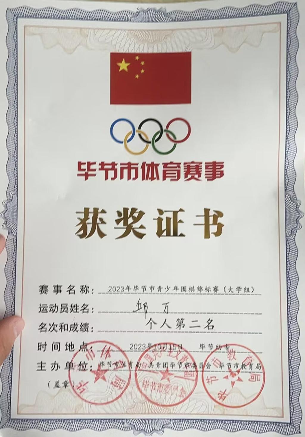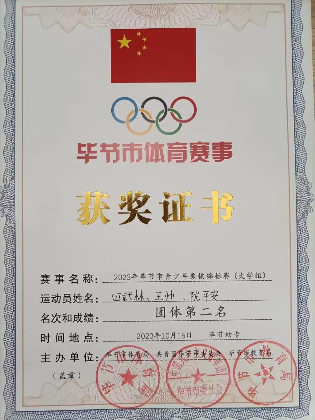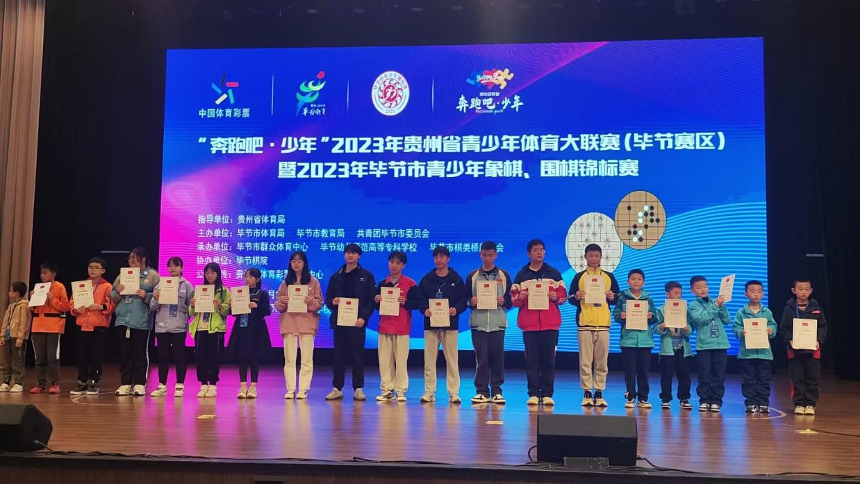 10月15日,“奔跑吧·少年”2023年贵州省青少年体育大联赛(毕节赛区)暨2023年毕节市青少年象棋、围棋锦标在毕节幼专举行,我校大学生棋牌协会5名成员参赛并获奖:
