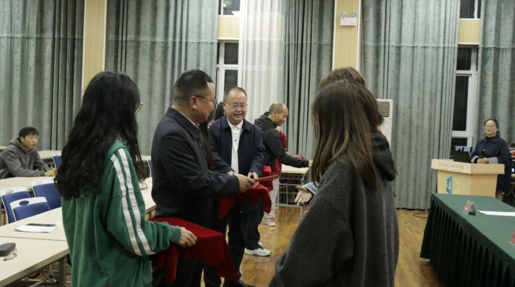 活动现场,石龙、张翔和赵曼对荣获春晖奖学金的同学颁发荣誉证书并合影留恋。