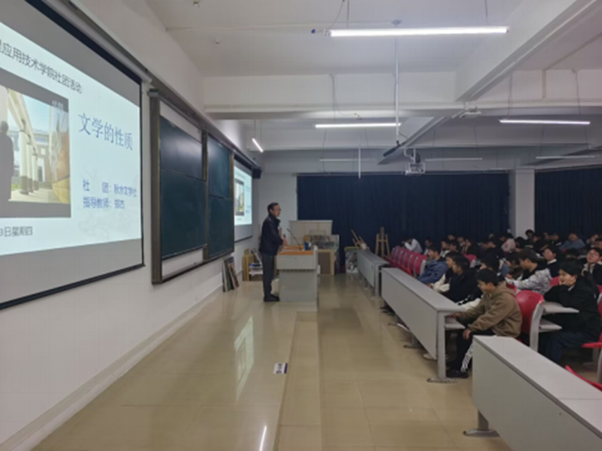 2023年11月23日,秋水文学社在绣山楼B栋201举办了“文学的性质”主题讲座。本次讲座由汉语言文学专业讲师郑杰担任主讲人,共198名学生参加。