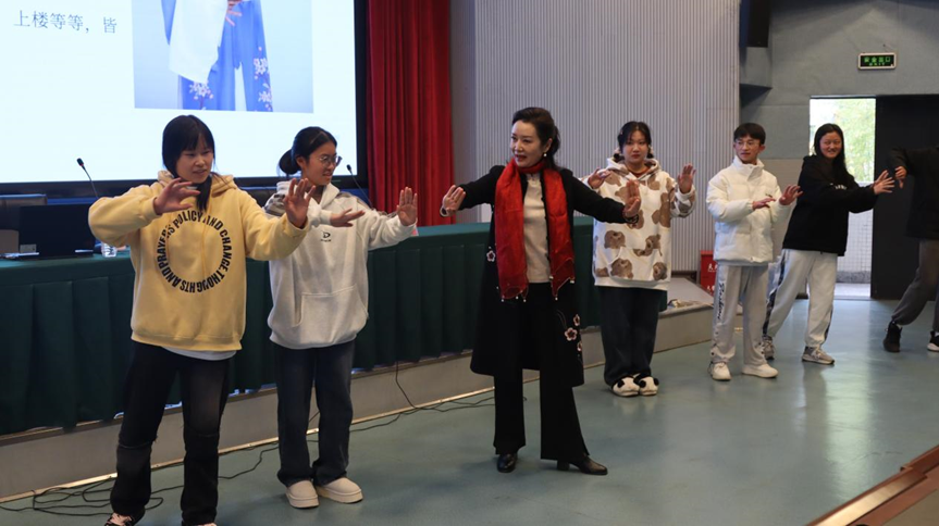 在讲到戏曲程式性特征、梅兰芳指法五十三式中的兰花指时,廖琪瑛邀请六位同学上台学习水袖等。她细致讲解和示范动作要领,带领怯生生的学生们勇敢迈出第一步,“零距离”感受越剧的独特魅力!