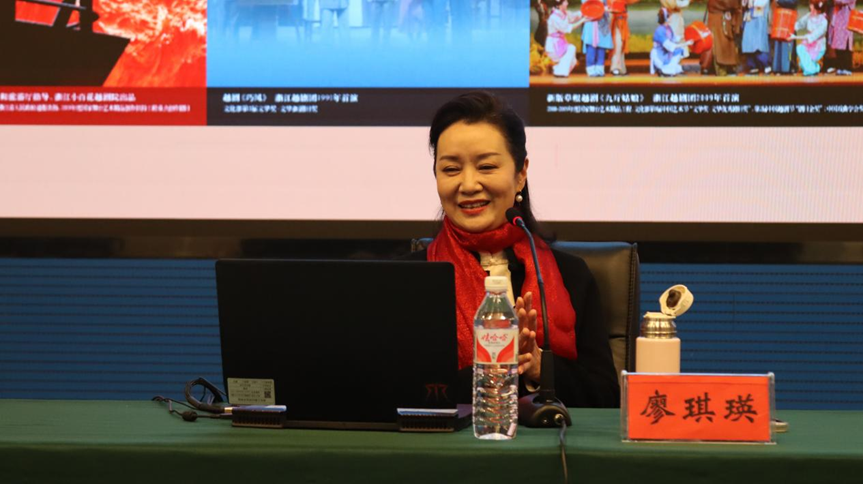 讲座开始,刘巧向观众介绍廖琪瑛。她擅长塑造不同行当、不同性格的人物形象,被誉为“多面手”。她斩获了省级第二届优秀小百花奖,省级第九届和第十届戏剧汇演优秀表演奖,省级青年演员汇演优秀演员奖等重量级奖项。此外,她曾出演20多部电视剧,如在《巾帼大将军》饰演赵母、《红粉须眉》饰演方云花。