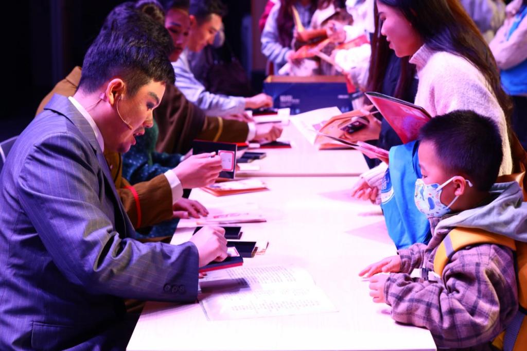 演出结束后,浙江小百花越剧院全体演职人员和我校汤宇华、夏鲲、高翩翩等领导合影留念,同学们也纷纷同艺术家们签名和拍照留念。