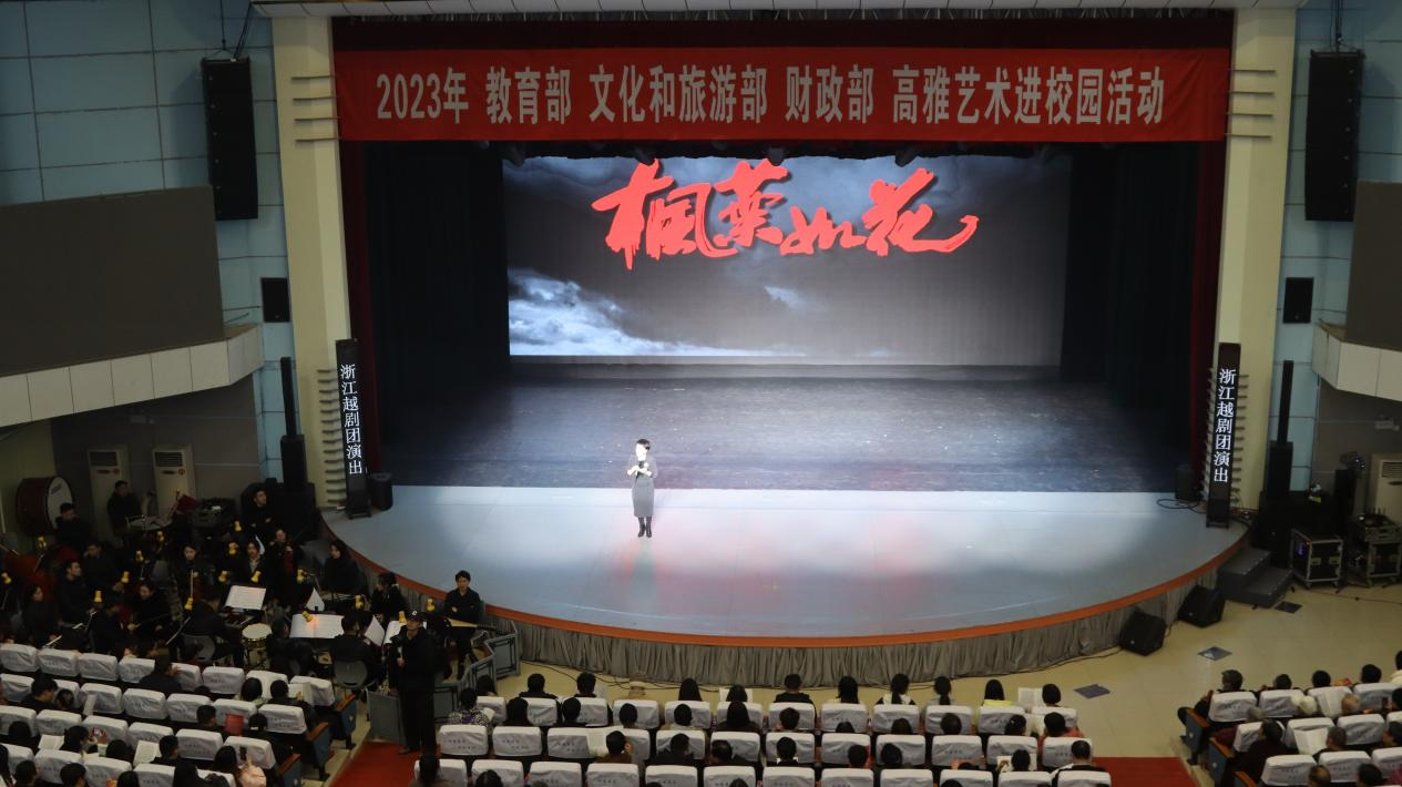 12月8日晚,2023年教育部、文化和旅游部、财政部“高雅艺术进校园”活动贵州工程应用技术学院站正式拉开序幕。在秋逸演播厅,浙江小百花越剧院为我校师生演出了越剧《枫叶如花》。学校党委副书记汤宇华,校党委委员、党委宣传部部长夏鲲,校团委书记高翩翩出席并观看演出。演出由学校工会副主席王天娥主持,全校800余名师生观看了演出。