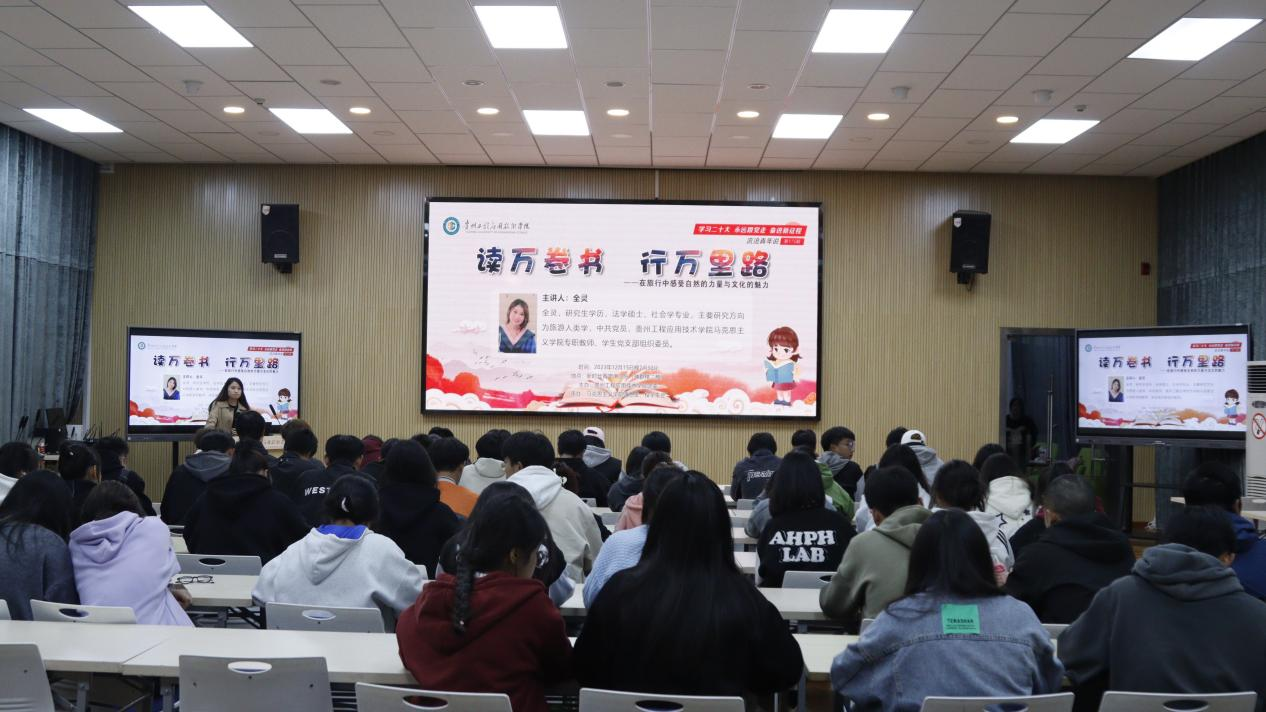 2023年12月14日晚,主题为“读万卷书,行万里路——在旅游中感受自然的力量与文化的魅力”的第175期流沧青年说在青年讲习所如期举行。此次活动特邀研究生学历、法学硕士、社会学专业,主要研究方向为旅游人类学,中共党员、贵州工程应用技术学院马克思主义学院专职教师、学生党支部组织委员全灵担任主讲人,全校约有 80 人参加。