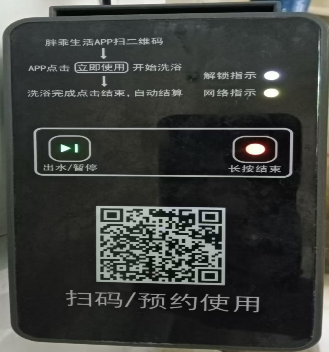 东区:下载胖乖生活-登录-点击淋浴-扫一扫设备二维码-点击出水/结束