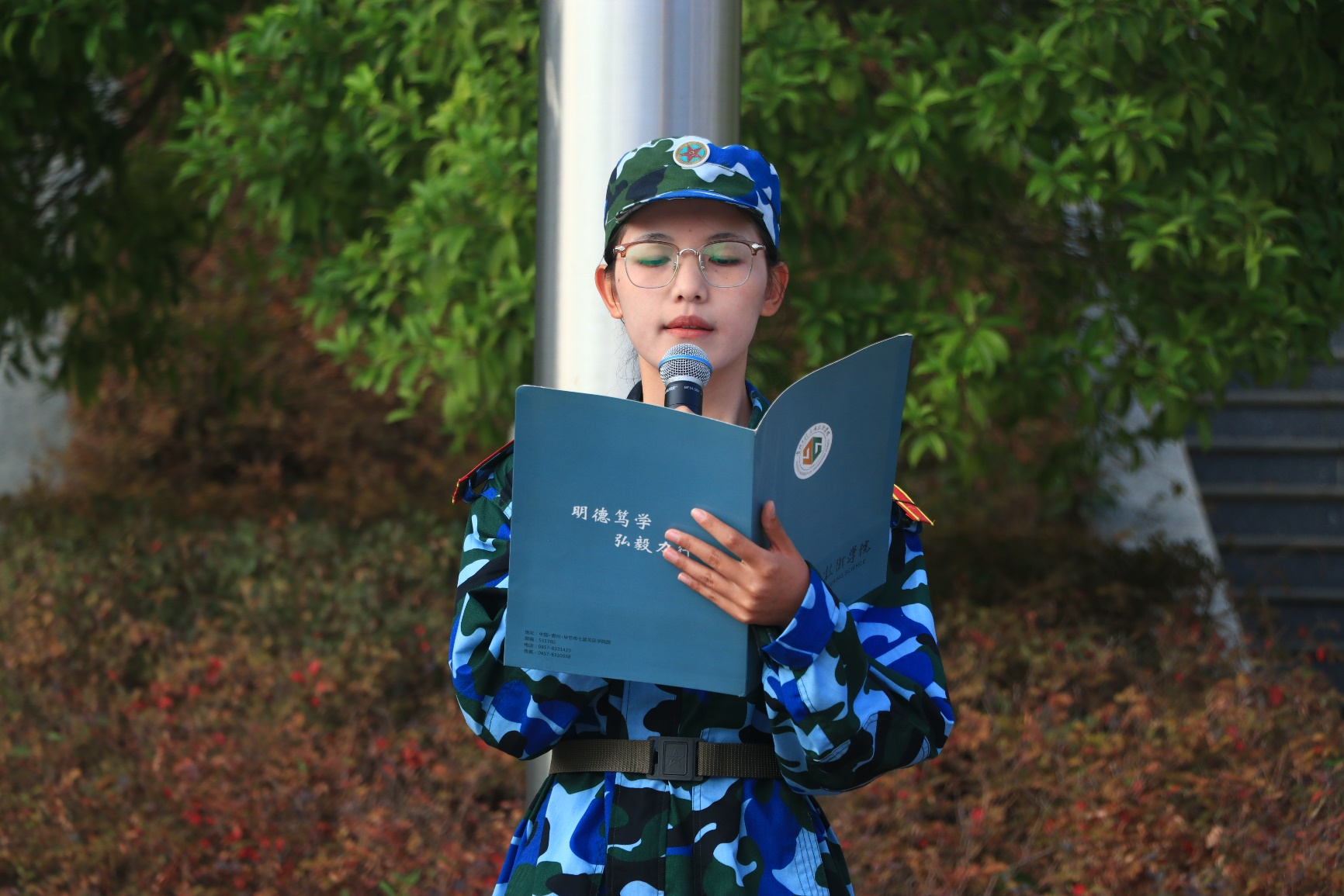 勿忘国耻勇担当,青春建功新时代。缓缓飞扬的国旗之下,学生代表耿轩带领大家回顾了发生在93年前的“九一八事变”,她说,“九一八事变”是一段让人难以忘怀的历史,它的发生令人痛心,怎敢想先辈们经历了多少辛酸、多少苦难,又有多少愤恨、多少挣扎才有了今天的中国。亡国无家,怎敢轻易忘怀。学生代表闫婷、王楠楠、王月分别朗诵《水调歌头·赵尚志》《沁园春·杨靖宇》《沁园春·赵一曼》三首诗歌,他们用铿锵有力的声音,展现了革命先烈为民族解放事业英勇斗争的精神风貌,更加坚定了为实现中华民族伟大复兴而努力奋斗的信念。她们表示,14年的不屈岁月里中国人民谱写了惊天地、泣鬼神的雄壮史诗,无数先烈用鲜血浇筑了抗日战争的伟大胜利。今天,我们阔步走在中华民族伟大复兴的征程上,作为新时代的青年,我们唯有勿忘昨天的苦难辉煌、无愧今天的使命担当,方能不负明天的伟大梦想!