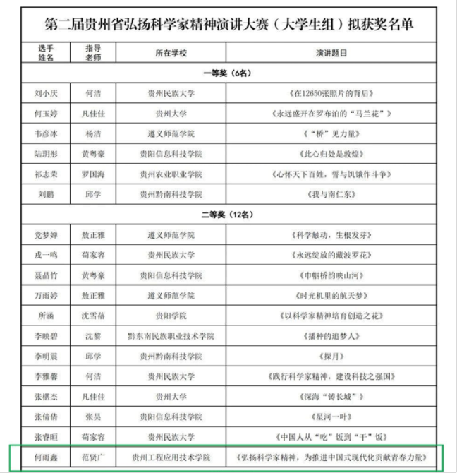 2024年9月23日,贵州省科学技术协会通过其官方微信公众号“科普贵州”公布了第二届贵州省弘扬科学家精神演讲大赛(大学生组)决赛获奖名单,我校何雨鑫同学的演讲作品《弘扬科学家精神,为推进中国式现代化贡献青春力量》在该项赛事中获二等奖。