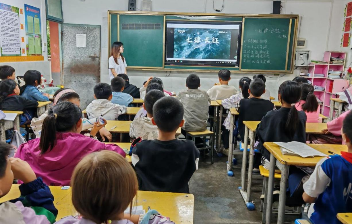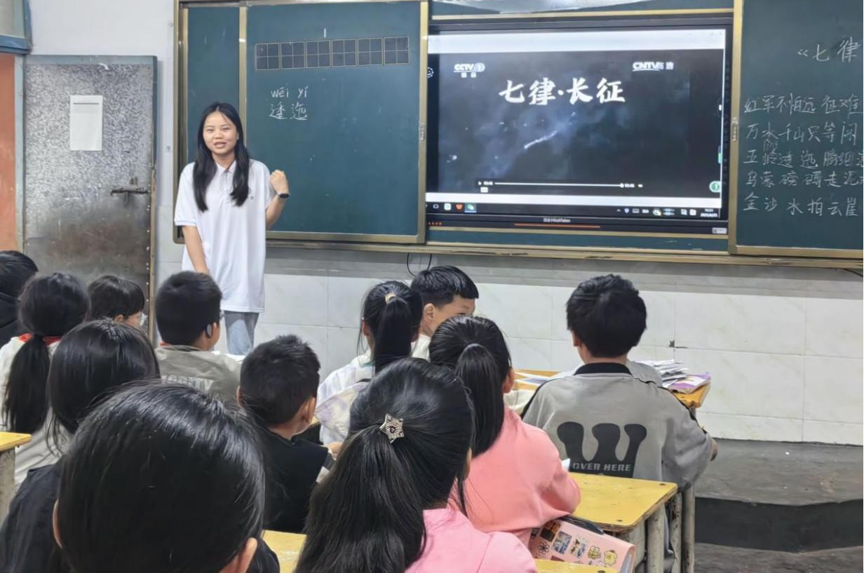 志愿者们延续“诵读+品析”的教学模式,以古诗为纽带,深化学生对长征精神的理解。他们通过播放长征的相关视频,将“金沙水拍云崖暖”的险峻、“大渡桥横铁索寒”的悲壮直观地呈现出来,引导学生在动态表达中感受诗句意境。随后,志愿者们带领孩子们朗诵诗句,用铿锵有力的诵读传递“万水千山只等闲”等诗词的豪迈气概。现场学生自发抄写诗句,纷纷表示回家后会带着家人一同背诵《七律·长征》。