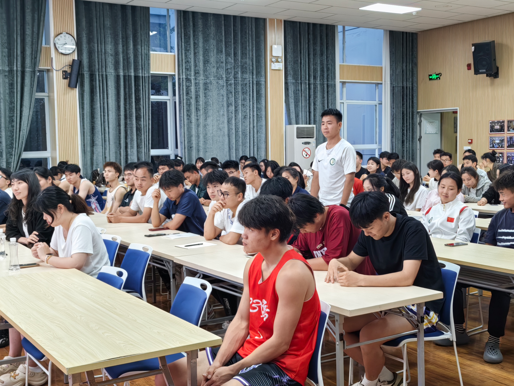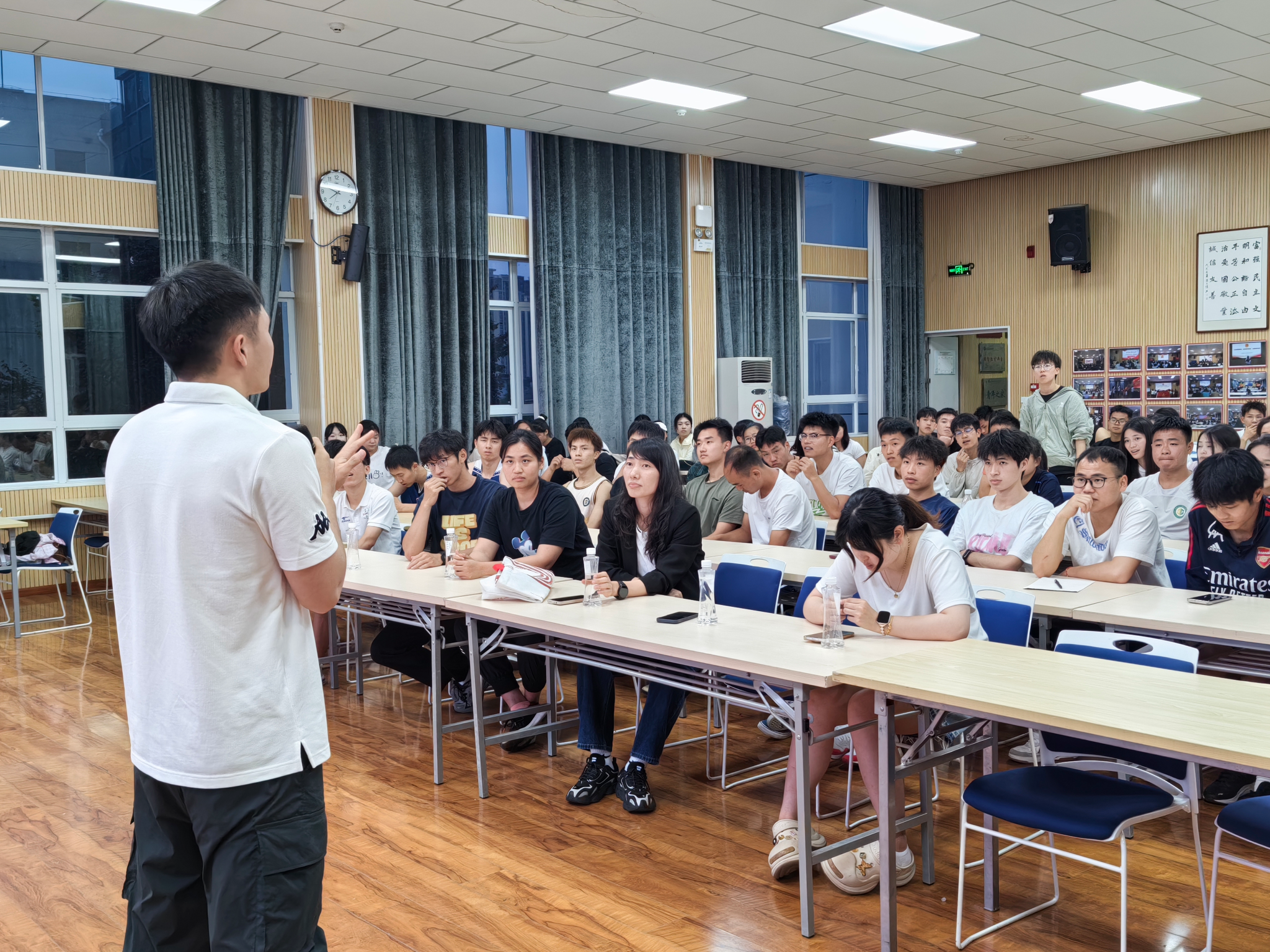 上海体育大学24级体育教育训练学专业的蒋世华学长为同学们分享了备考的规划、重点和释放压力的方法。学长语言幽默,情感饱满,现场掌声阵阵。