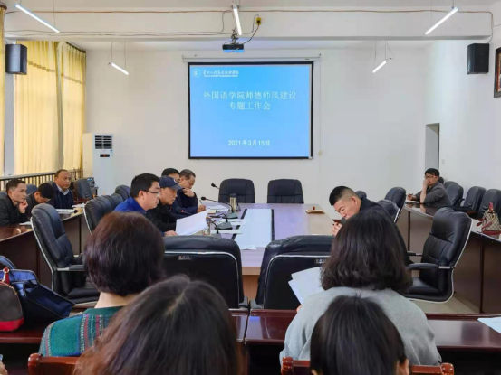 3月15日,外国语学院在学院二楼会议室召开了师德师风建设专题工作会,本次会议由外国语学院党总支陈永书记主持,学院全体教职工参加了本次会议。