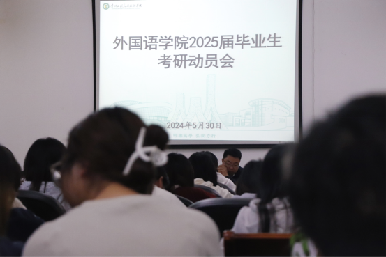 为引导我院2025届毕业生正确看待考研,充分了解考研现状与发展趋势,合理规划考研准备与本科学习,我院于2024年5月30日19:00在绣山A栋教学楼二楼会议室召开考研动员会。参加此次动员会的有外国语学院院长胡荣华、外国语学院辅导员文波、2024届两位成功考取研究生的优秀学子、以及2025届各班前20名和有考研意向的同学。