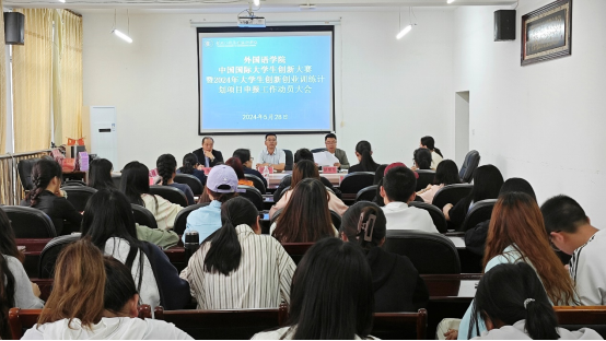 根据学校教务处下发的《贵州工程应用技术学院中国国际大学生创新大赛工作方案》《关于开展我校2024年大学生创新创业训练计划项目申报工作的通知》精神及要求,为扎实做好外国语学院项目的申报工作,争取项目上取得突破,外国语学院于5月28日下午召开了中国国际大学生创新大赛暨2024 年大学生创新创业训练计划项目申报动员部署会。学院党总支书记陈永、院长胡荣华、党总支副书记古清乙、各班班主任和班干部、团干部参加。动员部署会由院长胡荣华主持。